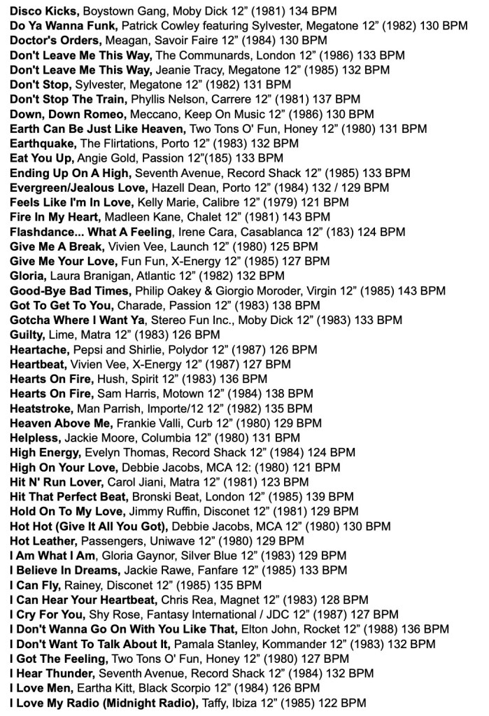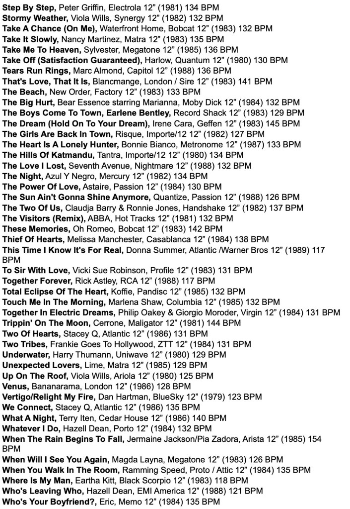 In 1990 Casey Jones, a leading New York club DJ throughout the 1980s, and remixer of many Hi-NRG tracks for the Disconet Program Service in the 80s, put together a list of 200 top Hi-NRG tracks spanning the whole decade, from 1980 to 1989. His top 200 (actually a total of 246 songs) was later published on hotdiscomix.de. Casey’s list is as good a place as any to start a discovery into 80s Hi-NRG. The songs are not ranked in any particular order, being listed purely alphabetically by song title. The major artists associated with Hi-NRG appear in this list, and their names will keep cropping up in subsequent posts – Sylvester, Bobby “O”, Lime, The Flirts, Hazell Dean, Dead Or Alive, to name but a few.