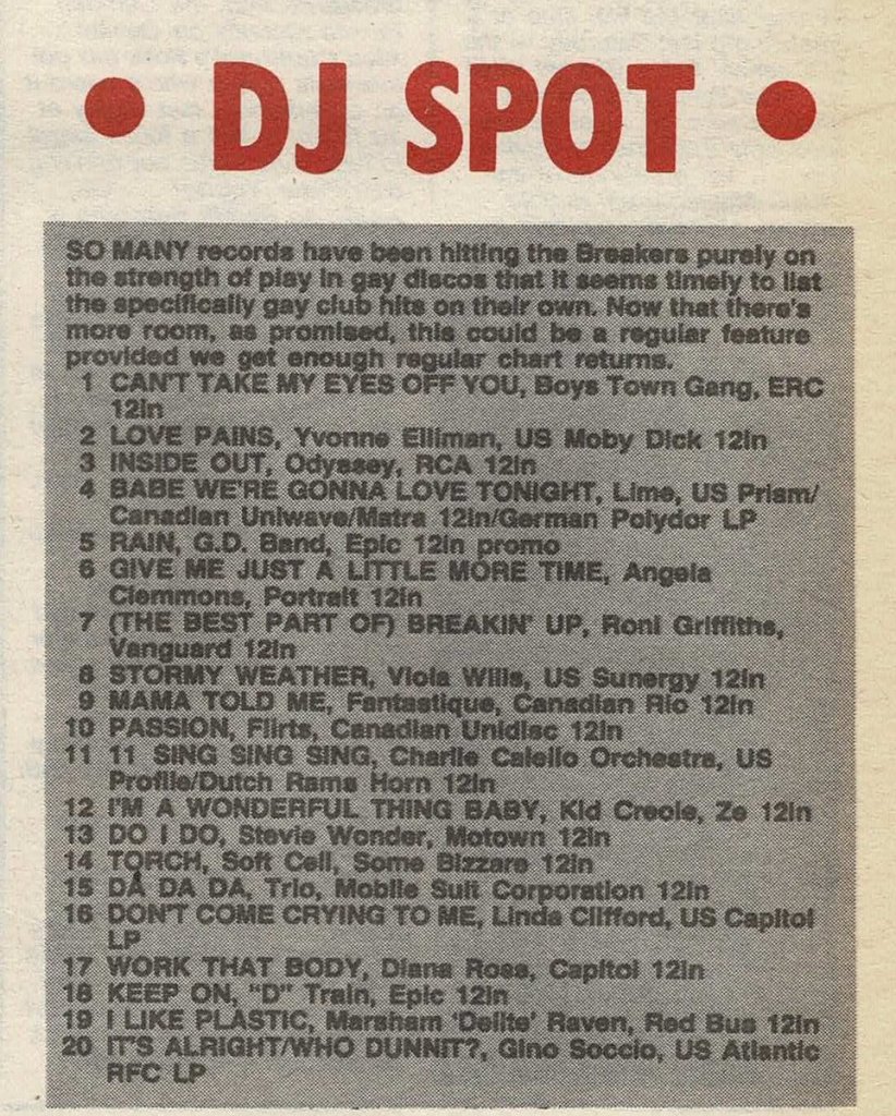 It’s quite interesting to compare the Billboard Hot Dance Chart with the UK and European Hi-NRG and Italo Charts. The Billboard Dance chart would often have a very good showing of San Francisco Boystown and Hi-NRG, as well as Synth Pop tracks, unlike the British mainstream dance clubs, which focussed their music policy mainly on soul and black music. In this Billboard chart, there are tracks from Paul Parker, Laura Branigan, Viola Wills and Yazoo that, apart from Laura Branigan, that firstly made their mark in gay club DJ sets and then remained firmly in the gay clubs in the UK, mostly failing to get any mainstream interest or play at all. Some of the rock and synth pop tracks, like A Flock Of Seagulls ‘I Ran’ and Thompson Twins ‘In The Name Of Love’ from this chart, would also find their way into Boystown Disco D J sets, especially in the larger American gay clubs.