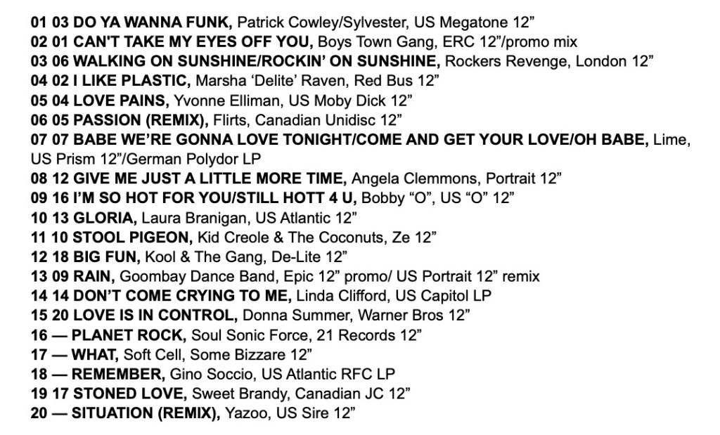 By way of comparison here is the Billboard Dance chart for the first week of September 1982. It has a good showing of Boystown and Hi-NRG, as well as Synth Pop tracks, unlike the British mainstream dance clubs, which focussed their music policy mainly on soul and black music. In this Billboard chart, there are tracks from Lime, Paul Parker, Laura Branigan, Partick Cowley & Sylvester and Sharon Redd that firstly made their mark in gay club DJ sets.