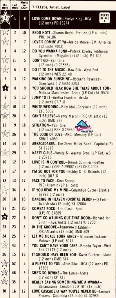 By way of comparison here is the Billboard Dance chart for the second week of October 1982. It has a good showing of Boystown and Hi-NRG, as well as Synth Pop tracks, which would find their way into in gay club DJ mix sets.