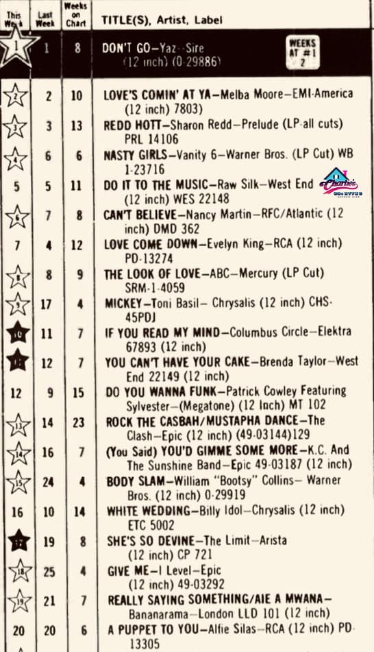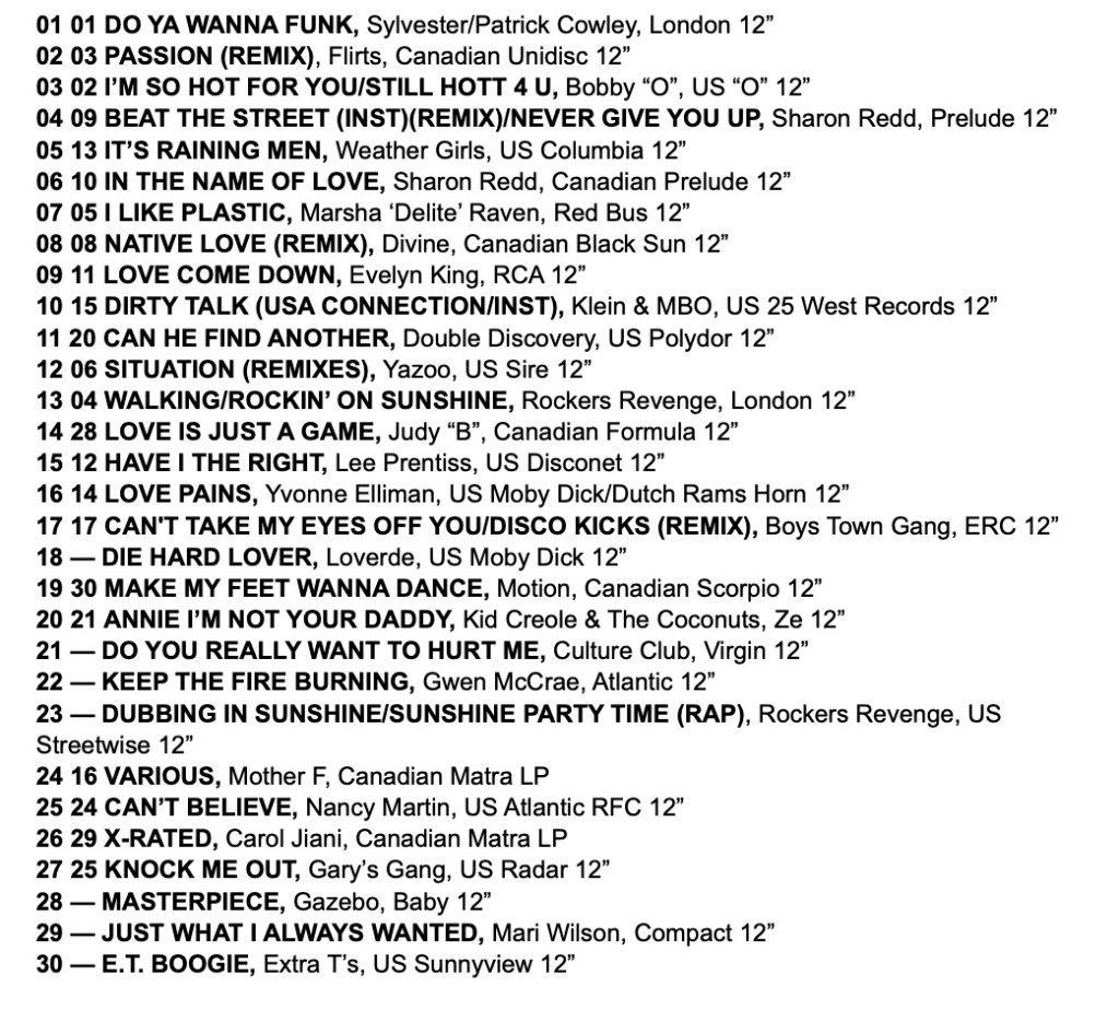 By way of comparison here is the Billboard Dance chart for the last week of October 1982. It has a good showing of Boystown and Hi-NRG, as well as Synth Pop tracks, which would find their way into in gay club DJ mix sets.