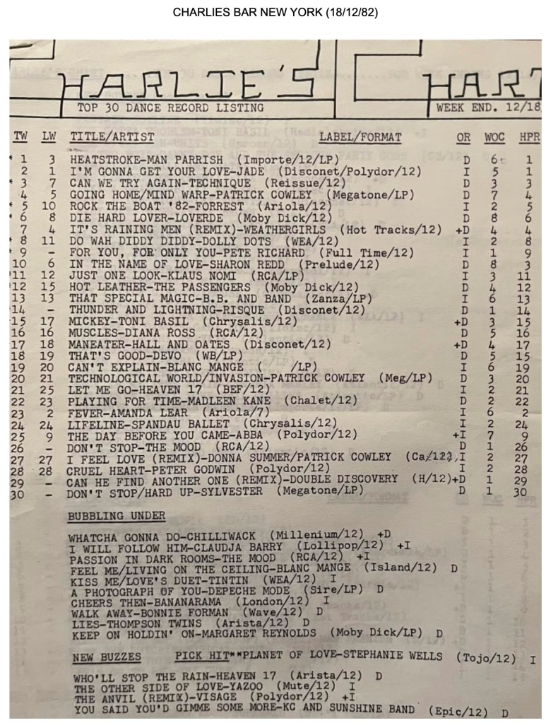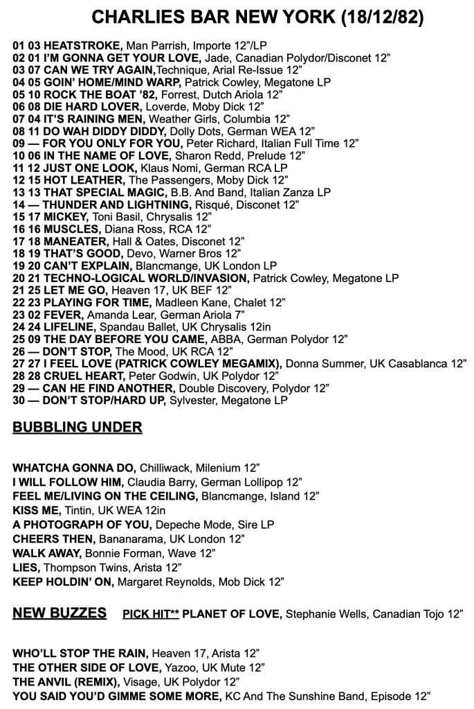 Uncle Charlie’s was a bar in Greenwich Village, New York, and this was their DJ, Robert James, Chart for 18th December 1982. I love the mix of British Hi-NRG, with British Synth Pop, Italo Disco, Canadian Disco and US NRG