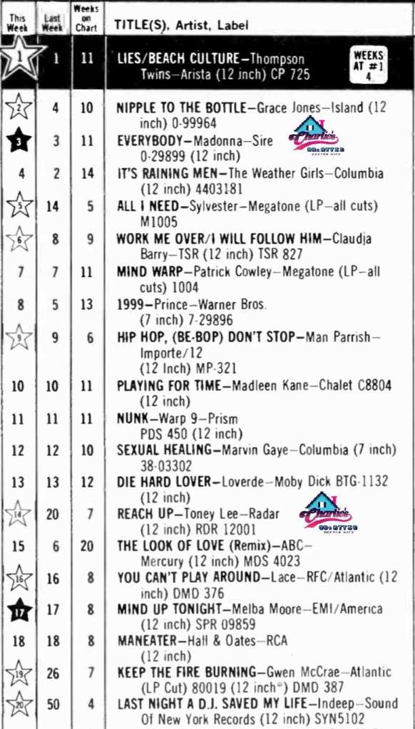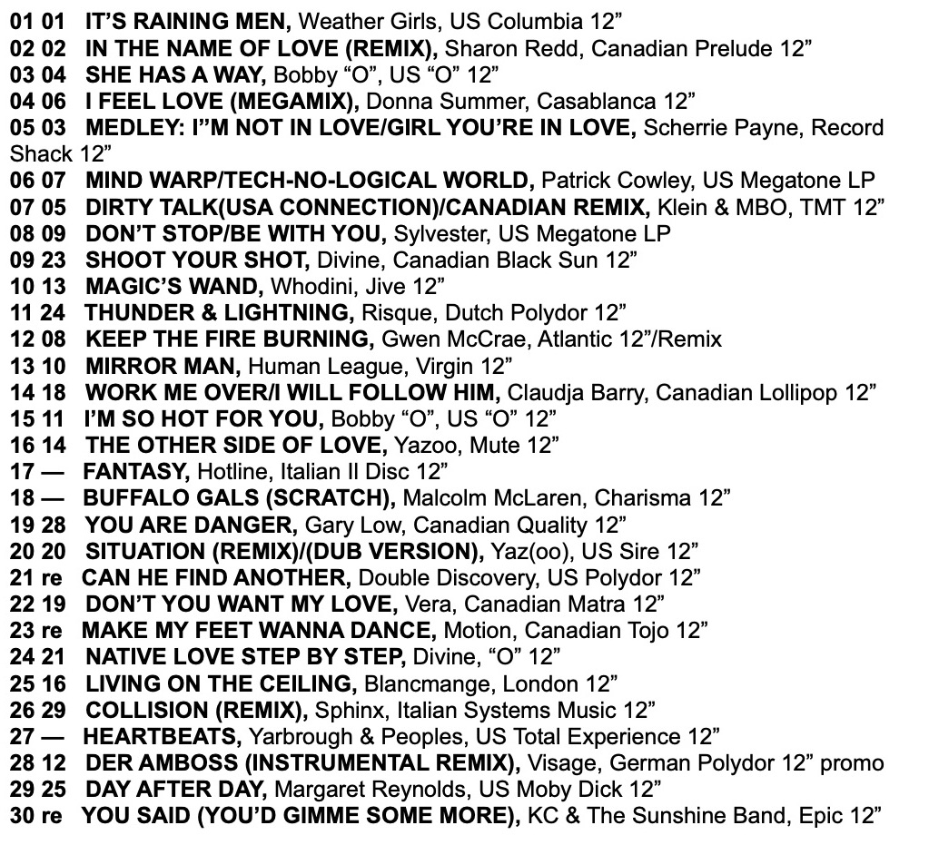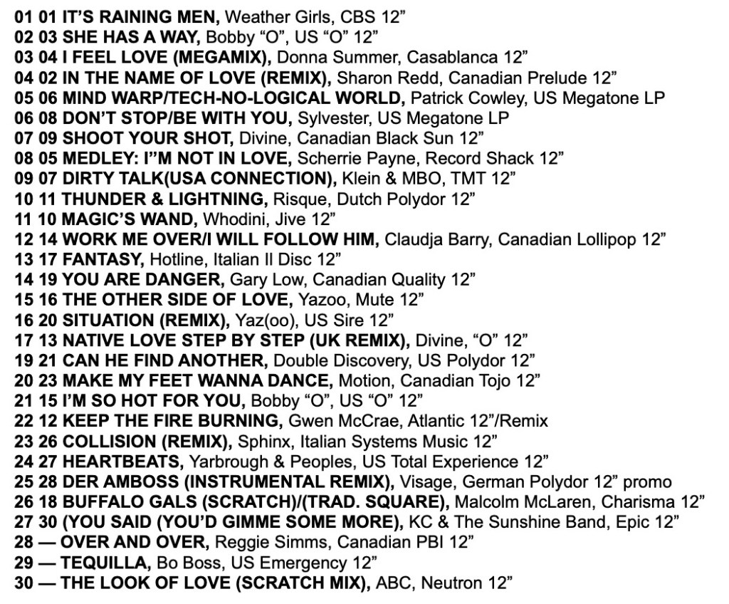 By way of comparison here is the Billboard Dance chart for the second week of January 1983. It has a good showing of Boystown and Hi-NRG, as well as Synth Pop tracks, which would find their way into in gay club DJ mix sets.
