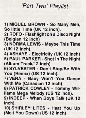 Part Two Nightclub was the premier gay nightclub in Nottingham, one of the main cities in the East Midlands of England. Their charts were submitted to Alan Jones at Record Mirror magazine to count towards the Record Mirror Boystown Disco/Hi-NRG charts.