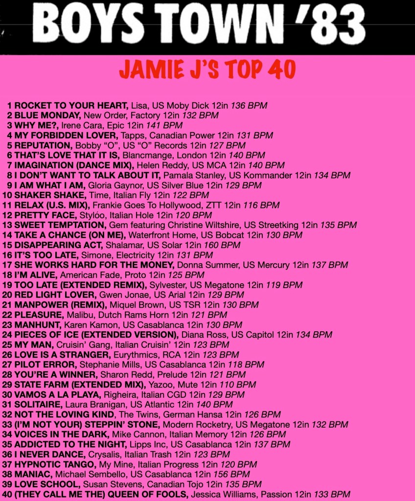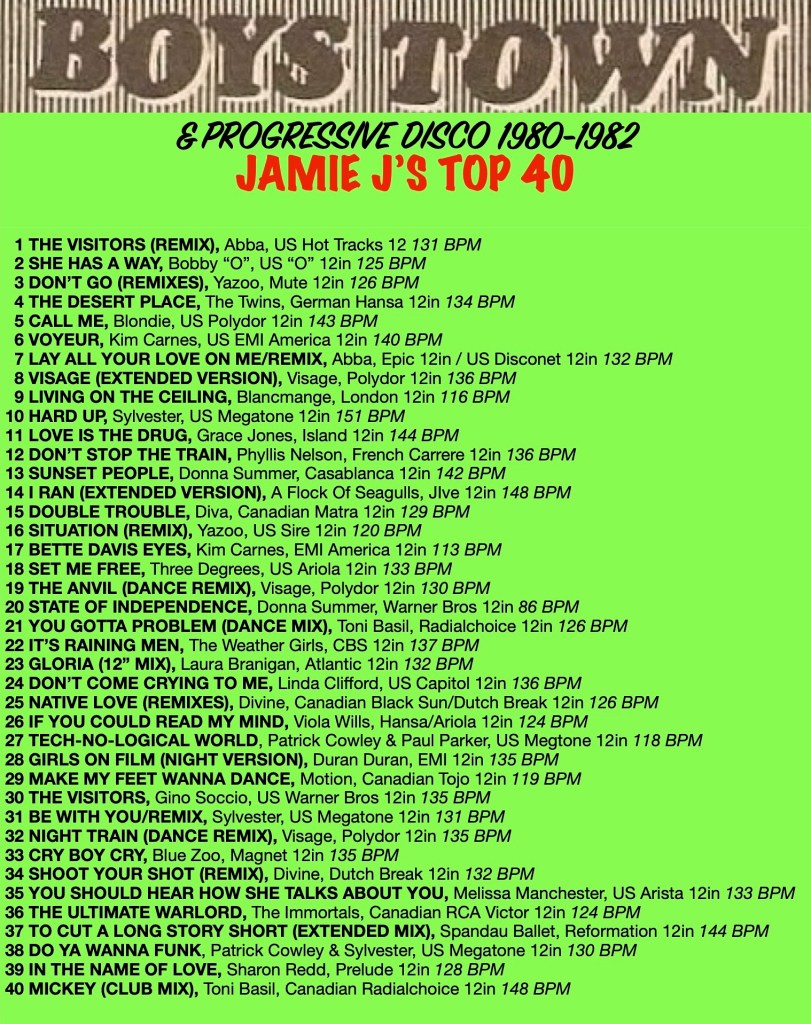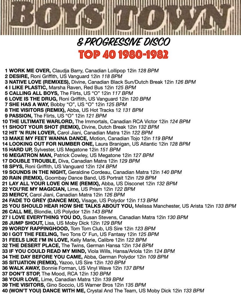 From the early 2000s internet forums, YouTube, Discogs and a myriad of other on-line resources have opened up opportunities to dig deep into the world of Italo Disco, Boystown Disco and early Hi-NRG, enabling me to research the most popular and enduring tracks from the period, as well as many tracks I had not come across before. This worm hole research has also been a voyage of discovery about long forgotten obscurities, and that some of these rare original vinyl records are now highly sought after by collectors and can trade for quite large sums of money, whilst some others from this period are now being re-released on vinyl for a new collecting audience.