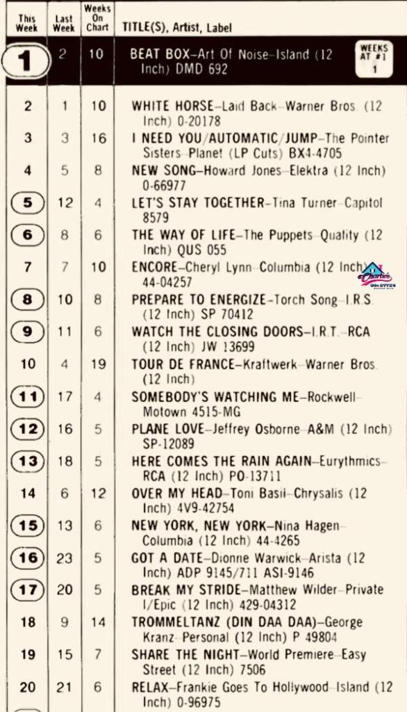 The Billboard Dance chart would often have a very good showing of Hi-NRG, as well as Synth Pop tracks, unlike the British mainstream dance clubs, which focussed their music policy mainly on soul and black music. In the USA Toni Basil’s ‘Over My Head’ was huge on gay dance floors and in gay club DJ mix sets.