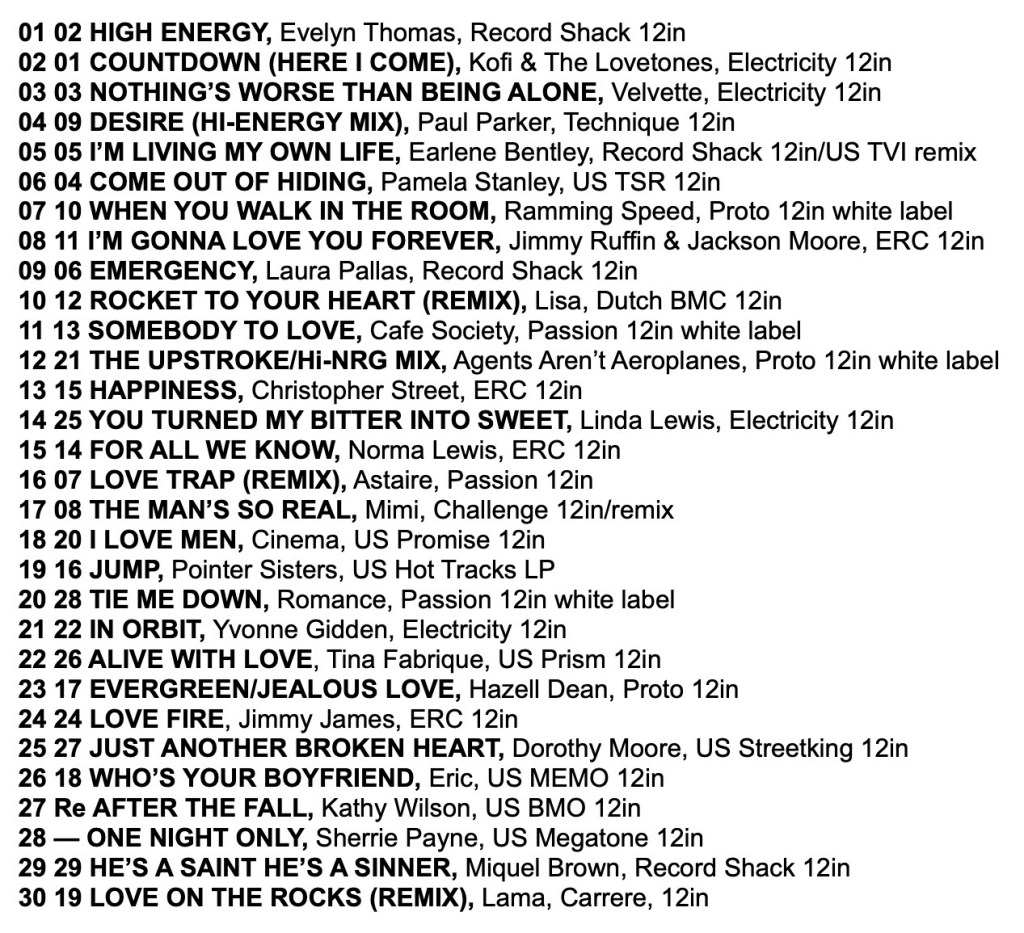 A scan of the original printed Record Mirror Hi-NRG Chart from 7th April 1984