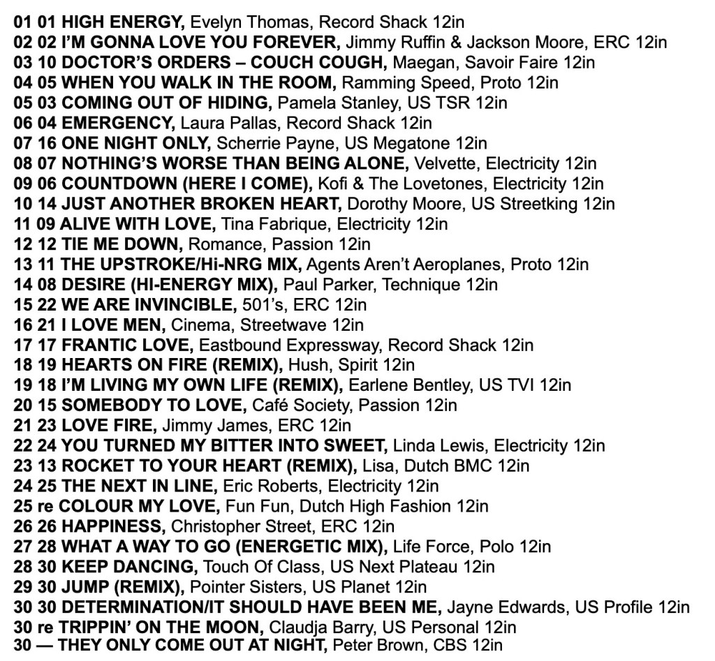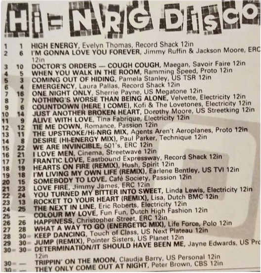 A scan of the original printed Record Mirror Hi-NRG Chart from 12th May 1984