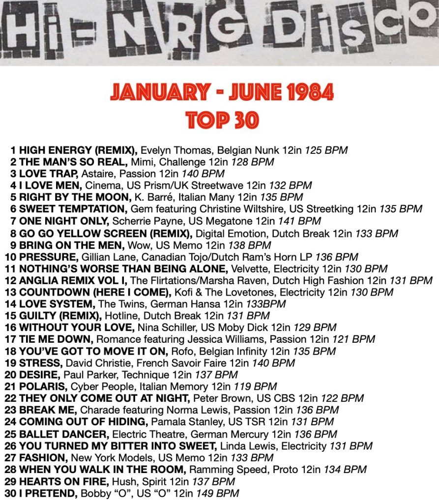 By 1984, this North American and European influenced less funky, synthesiser led disco, with its roots firmly in the San Francisco Boystown sound, was in full swing on the British Gay Scene, leading to the establishment of independent British Hi-NRG record labels such as Passion, Record Shack, ERC, Electricity and Proto amongst others, producing dance records for the scene, as well as licencing a few US and European tracks for UK release. Alongside this, underground imports from America, Canada and Europe would still continue to be big hitters in the Record Mirror Hi-NRG charts, especially if the records had been big hits in super clubs like The Saint in New York.