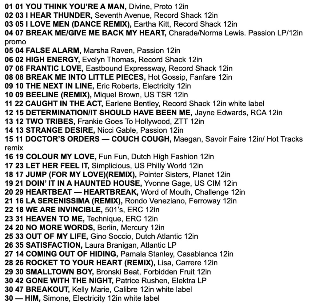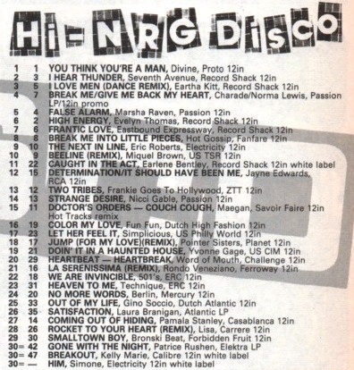 A scan of the original printed Record Mirror Hi-NRG Chart from 7th July 1984