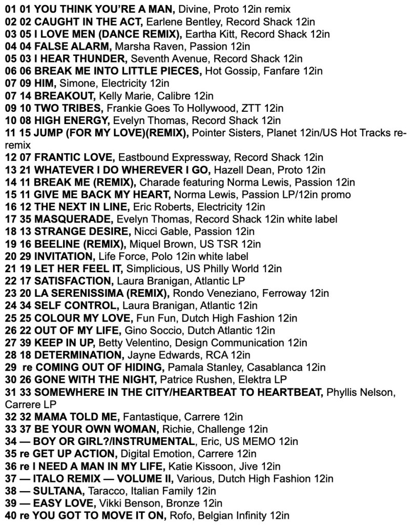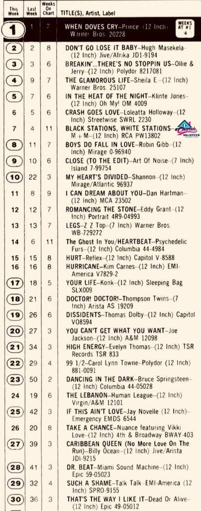 This Billboard Hot Dance Chart from the third week of July 1984 is a fabulous compliment to the Hi-NRG tracks being played by DJs in British gay clubs. I’ve heard Pop Rock tracks such as Bruce Springsteen’s ‘Dancing In The Dark. and Z Z top’s ‘Legs’ added into Hi-NRG DJ sets from the time – and they fit pretty nicely into the Hi-NRG vibe of 1984.