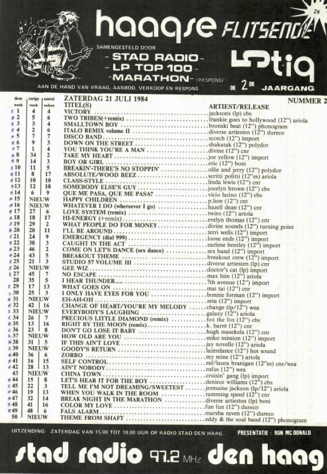 A scan of the original printed Record Mirror Hi-NRG Chart from 21st July 1984