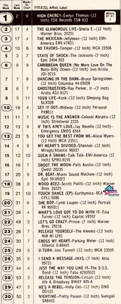 This Billboard Hot Dance Chart from the first week of September 1984 is a fabulous compliment to the Hi-NRG tracks being played in by DJs British gay clubs. Ray Parker Jr’s ‘Ghostbusters’ movie theme was hugely popular in the gay clubs where the DJs would mix it into the current stock of Hi-NRG tracks from the likes of Evelyn Thomas who held the number one spot int his chart.