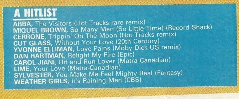 Back on 30th July 1983, James Hamilton had already noted in Record Mirror that some of the bigger Boys Town Disco tracks, such as Hazell Dean’s ‘Searchin’‘ and Miquel Brown’s ‘So Many Men, So Little Time‘, were getting club play in straight venues and so ran a spread about this trend stating ‘some of the hottest chart sounds around have come straight from the not-so-straight clubs and those records are starting to cross over’. The feature suggested the record list below as a guide to Boys Town disco, and mentioned some of the gay nightclubs around the UK that played Boys Town.