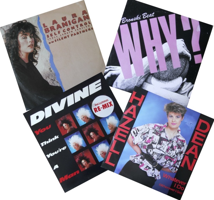 As I explored in my blog post about Hi-NRG coming out of the gay nightclubs and into the UK national charts in the first half of 1984, Hi-NRG continued to be part of the British music scene through the summer and autumn of 1984. In August of that year Divine’s ‘You Think You’re A Man‘ hit number 16 and Hazell Dean’s ‘Whatever I Do, Wherever I Go‘ peaked at number 4 in the UK national charts, and were followed by Laura Branigan’s ‘Self Control‘ and Bronski Beat’s ‘Why‘ both being top ten hits. A couple of very famous San Francisco gay disco tracks had made it out of the gay clubs in earlier years, notably Patrick Cowley & Sylvester’s ‘Do Ya Wanna Funk‘ and the Boys Town Gang ‘Can’t Take My Eyes Off You’, reaching number 32 and number 4 respectively in 1982 – but until 1984, although not an unknown occurrence, such tracks making the UK top 40 had been very rare.