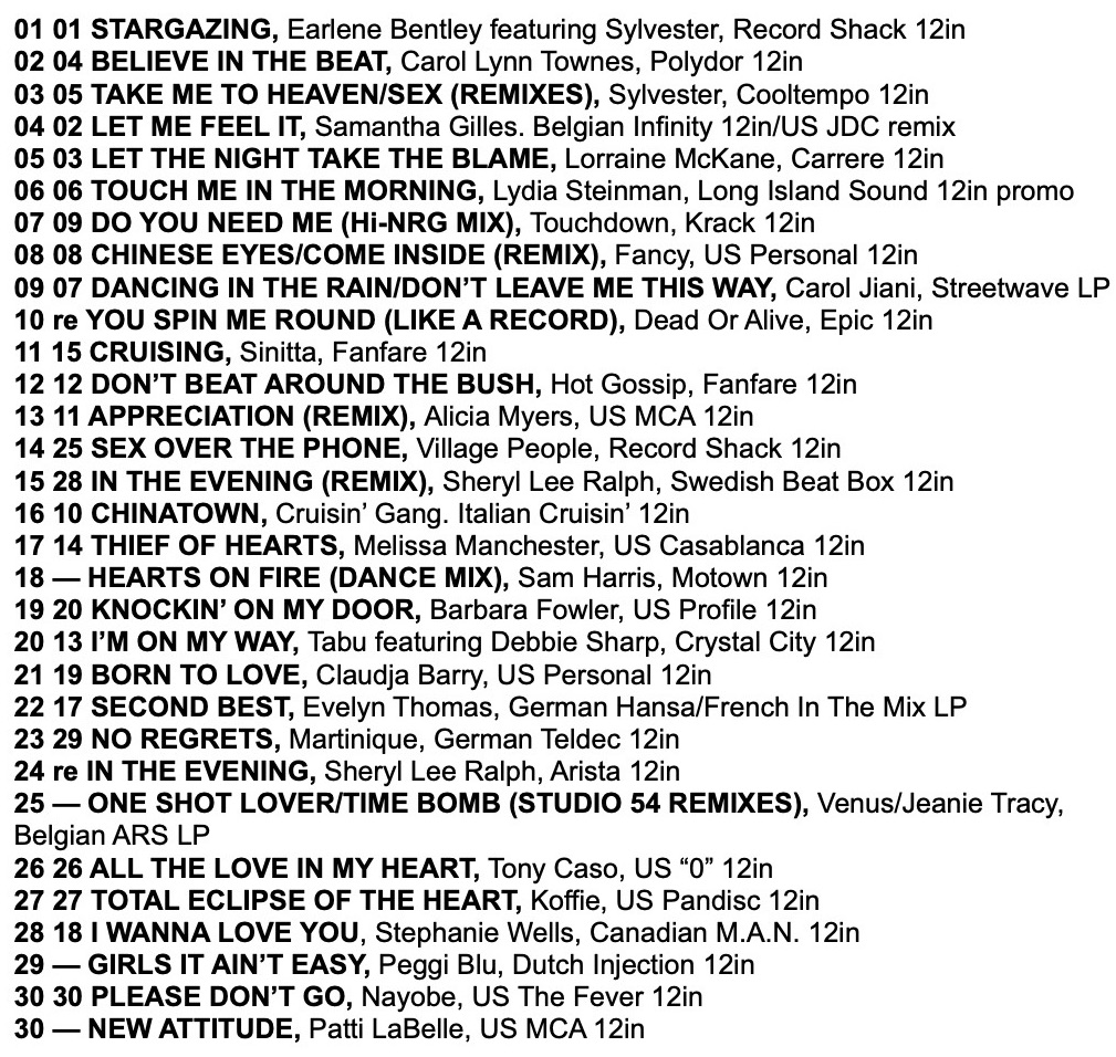 Over the years the Hi-NRG Charts were printed in Record Mirror, rumours and accusations of chart rigging were often voiced amongst the DJs and those on the scene. In a bid to counter these accusations, James Hamilton produced an alternative Hi-NRG chart this week, made up from what he called the more General Venues, excluding chart returns from the major clubs like Heaven in London.
