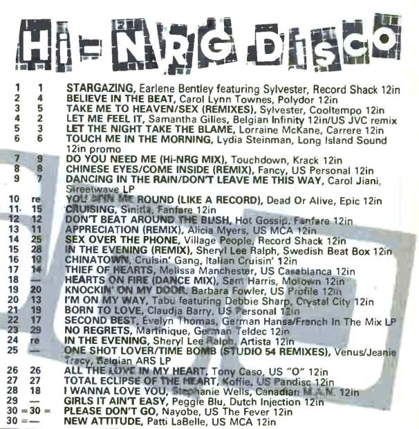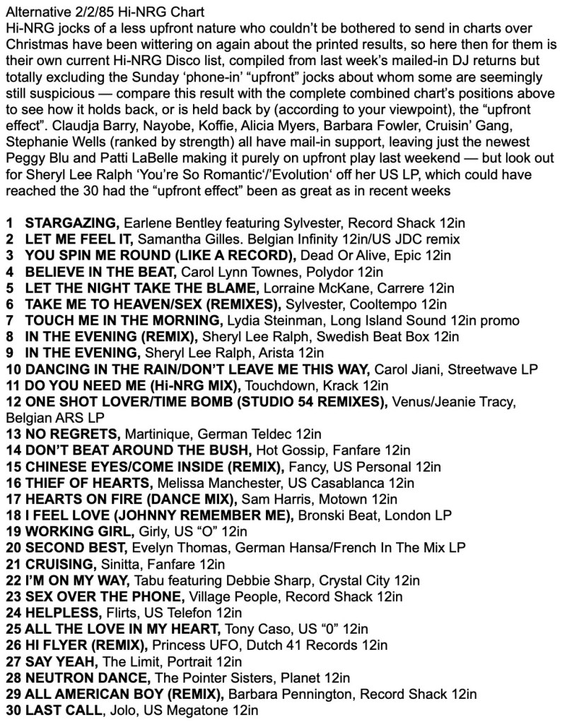 A scan of the original printed Record Mirror Hi-NRG Chart from 2nd February 1985