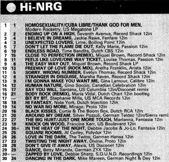 A scan of the original printed Record Mirror Hi-NRG Chart from 20th July 1985