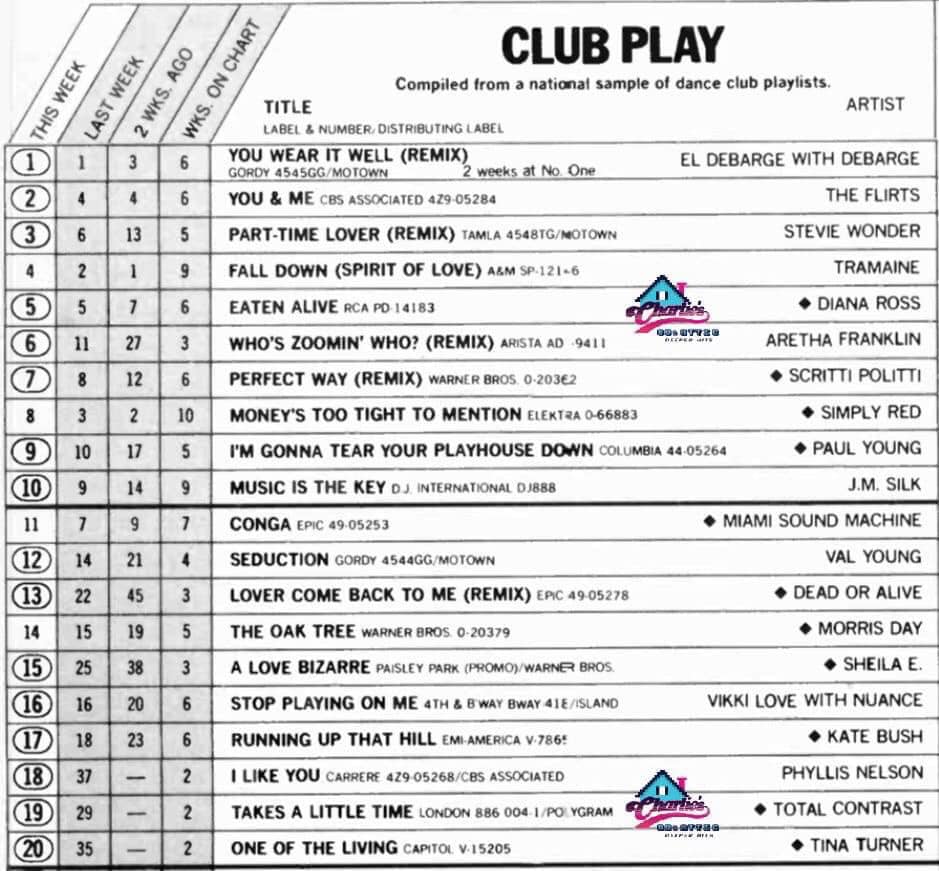 This Billboard 12 inch Singles/Dance chart has many tracks that were on heavy rotation in the top gay clubs alongside current Hi-NRG hits. Entries from the likes of Diana Ross and Phyllis Nelson had more chance of becoming mainsteram in the USA, whereas in the UK, these tracks tended to remain firmly in the gay clubs and failed to get much mainstream interest or play at all.