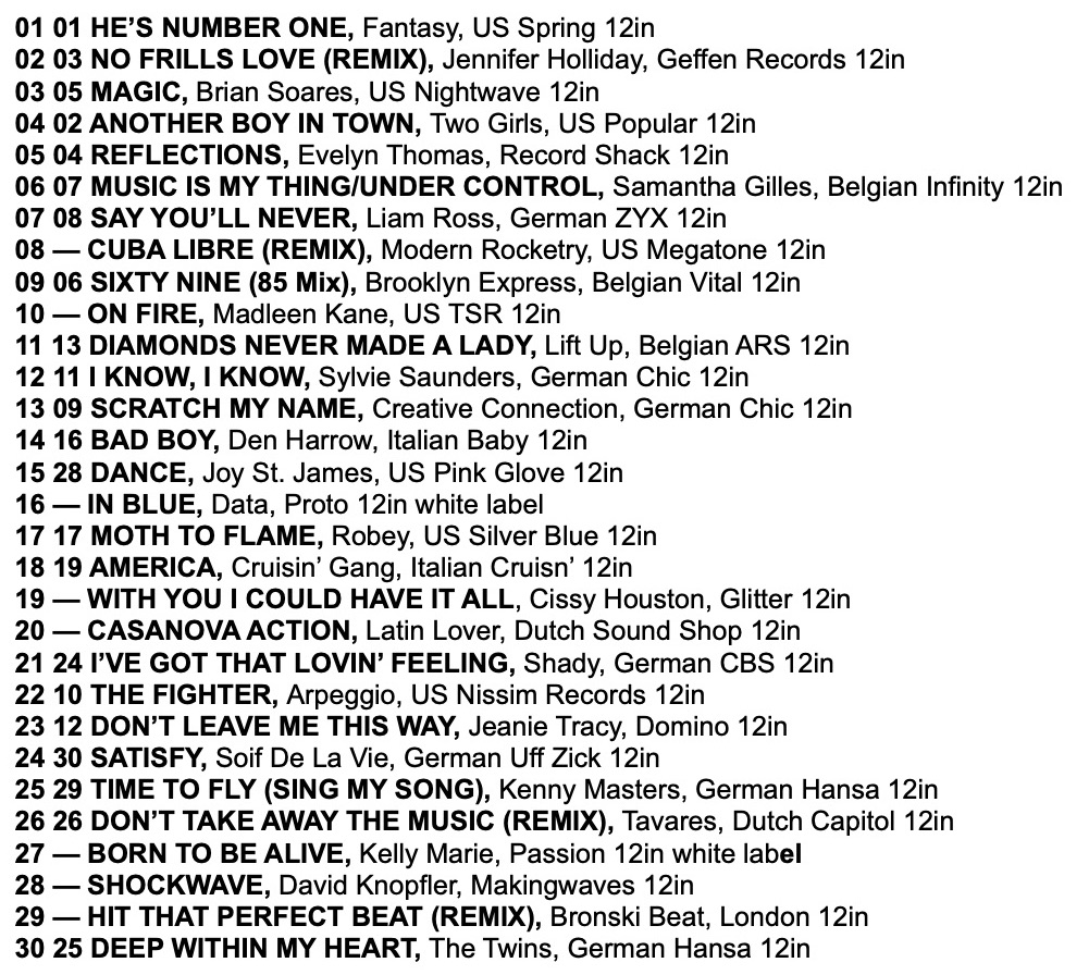 This Billboard Hot Dance Chart from the last week of December 1985 is a fabulous compliment to the Hi-NRG tracks being played by DJs in British gay clubs. Jennifer Holliday and Phyllis Nelson overlap in both the Record Mirror Hi-NRG and Billboard Dance Chart, whilst Alisha, Eurythmics & Aretha Franklin, Grace Jones, Baltimora and Rochelle were amongst firm favourites in British gay DJ club sets.