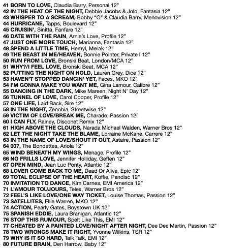 First published in 1978 as Disco News, Dance Music Report was an American twice monthly music magazine focussing on the music played in nightclubs and for radio DJs who promoted dance music. It continued to be published until 1992. Alongside reporting about dance music, DMR published various charts, including a Hi-NRG chart, throughout the 80s. Here is DMR’s Hi-NRG top 80 for 1985: