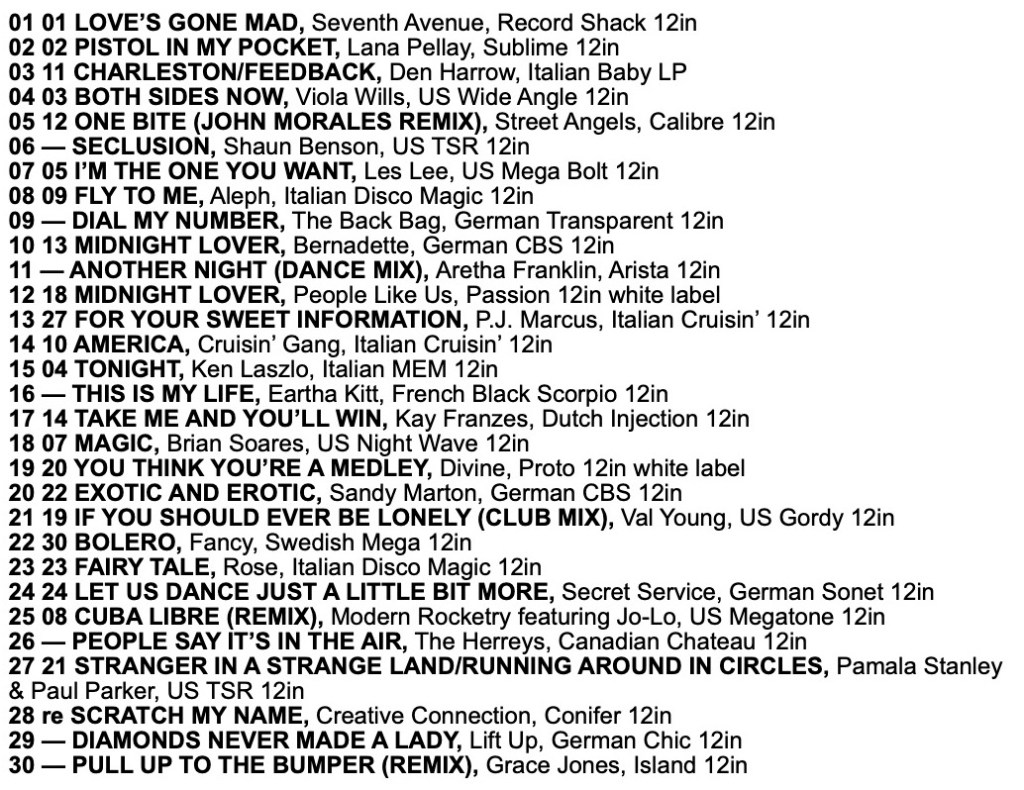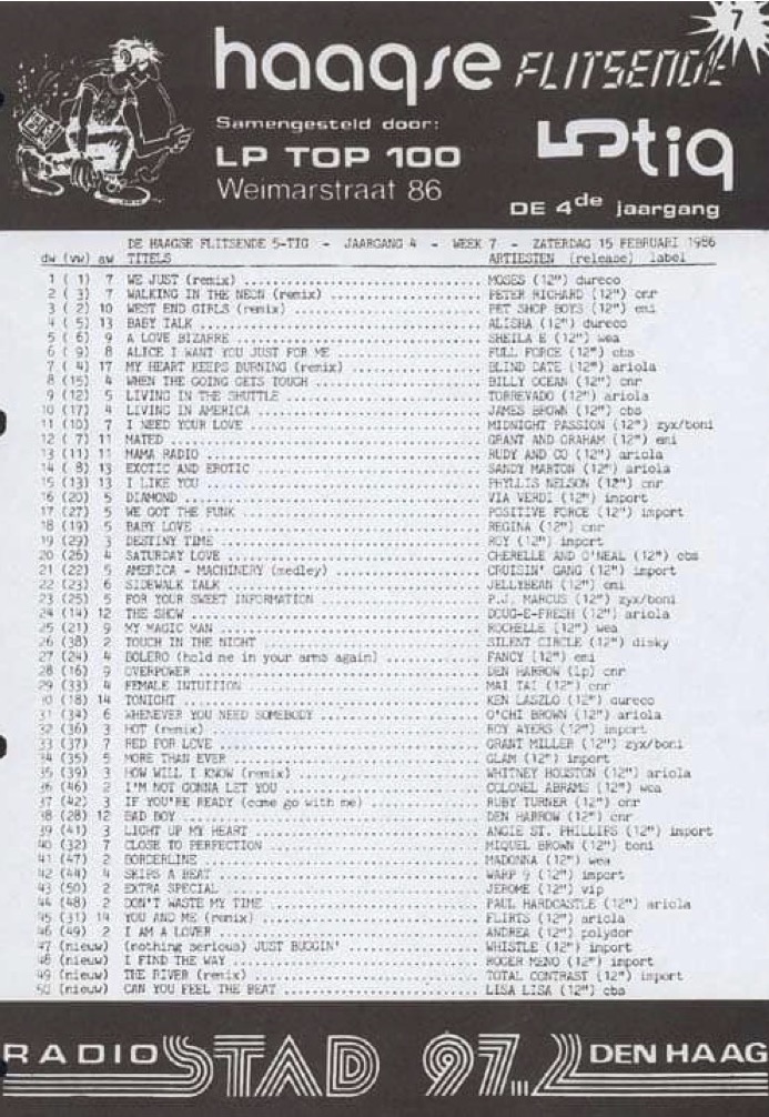 A scan of the original printed Hi-NRG Chart from Bali Hai nightclub for February 1986