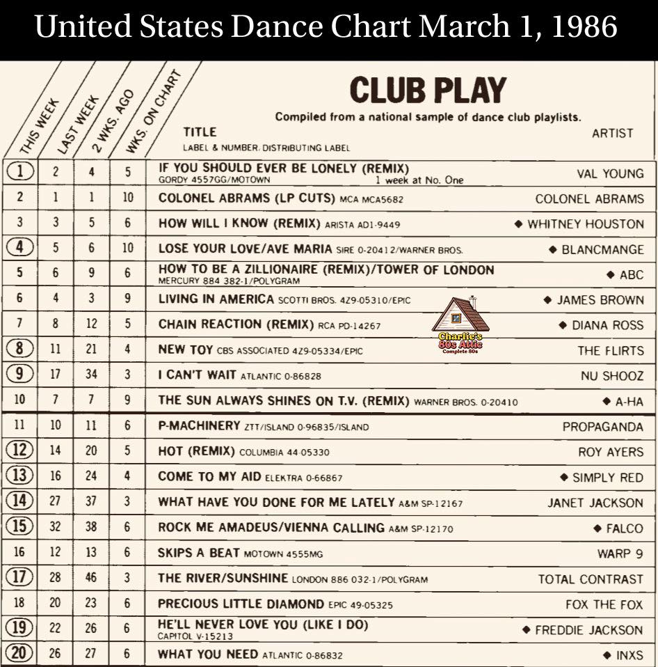 This Billboard Hot Dance Chart from the first week of March 1986 is an interesting compliment to the Hi-NRG tracks being played by DJs in British gay clubs. A-ha, Val Young, Whitney Houston, Diana Ross, The Flirts, Propaganda and Janet Jackson would all become firm favourites in British gay DJ club sets in 1986.