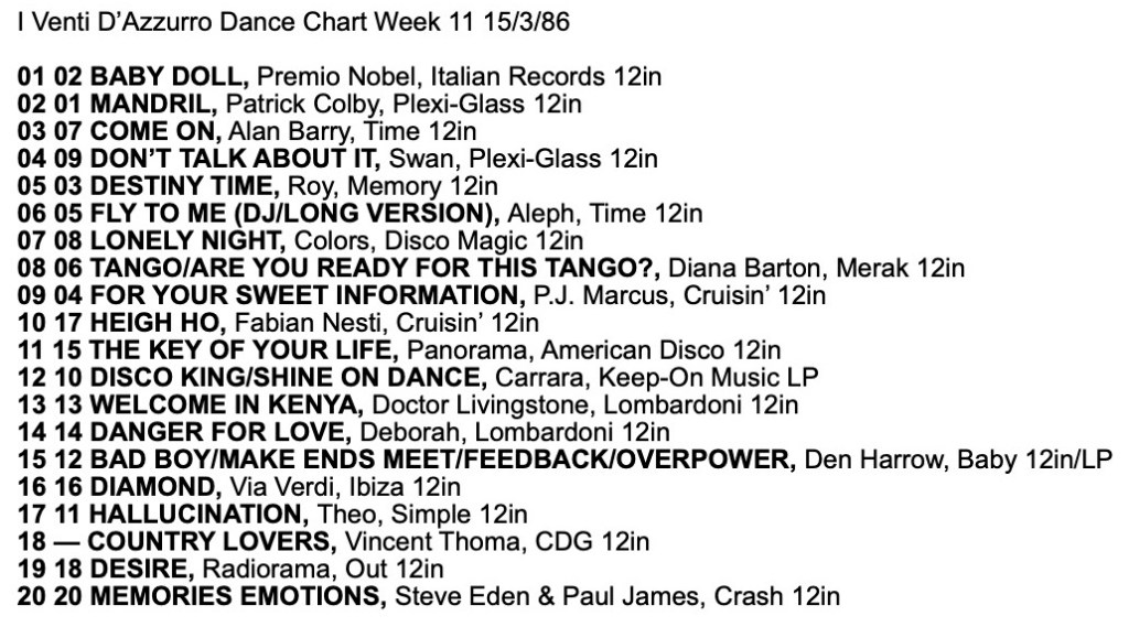 I Venti d’Azurro Italo Disco Chart 15th March 1986