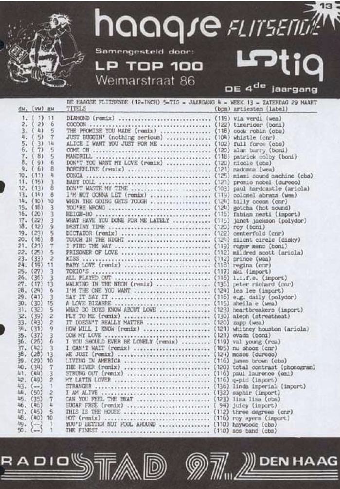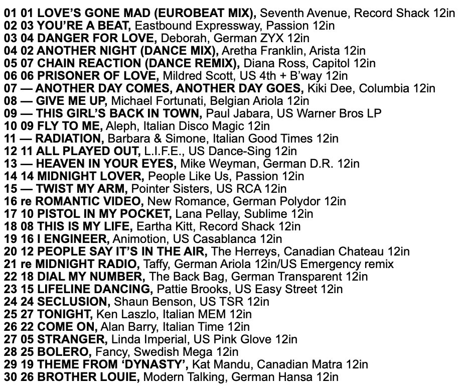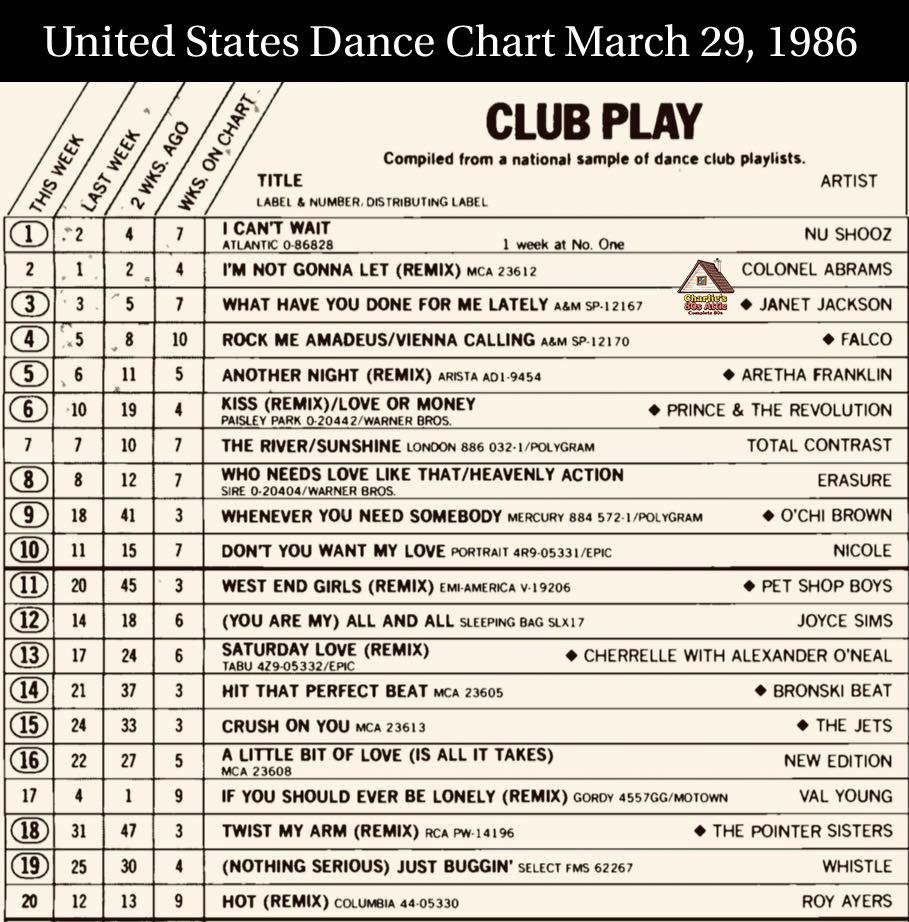 This Billboard Hot Dance Chart from the last week of March 1986 is an interesting compliment to the Hi-NRG tracks being played by DJs in British gay clubs. Aretha Franklin, Erasure, O’Chi Brown, Nicole, Pet Shop Boys, Val Young, Bronski Beat and Pointer Ssiters would become firm favourites in British gay DJ club sets in 1986.