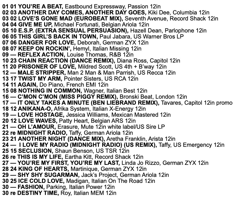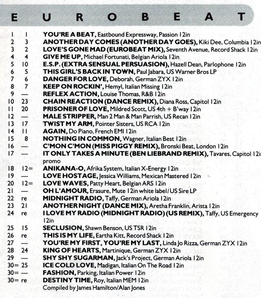 A scan of the original printed Record Mirror Eurobeat Chart from 19th April 1986