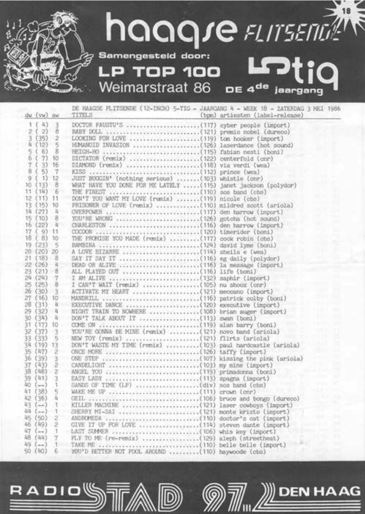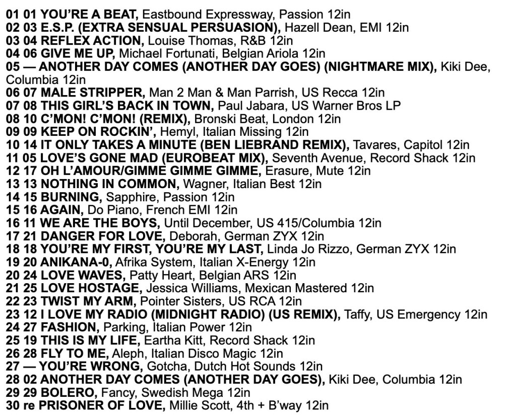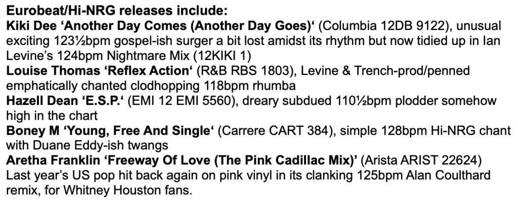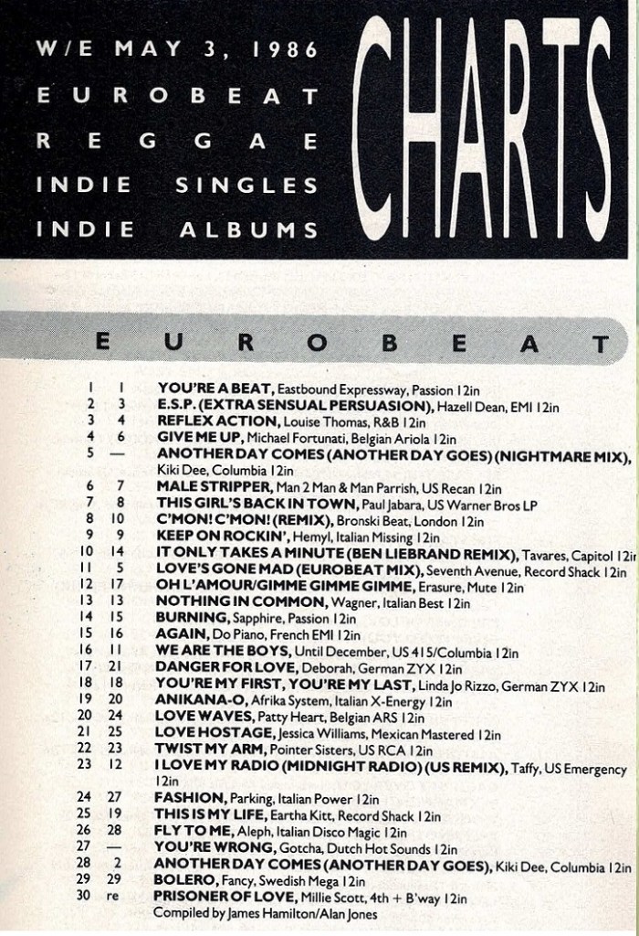 A scan of the original printed Record Mirror Eurobeat Chart from 3rd May 1986