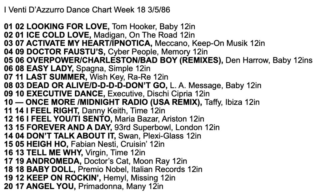 I Venti d’Azurro Italo Disco Chart 3rd May 1986