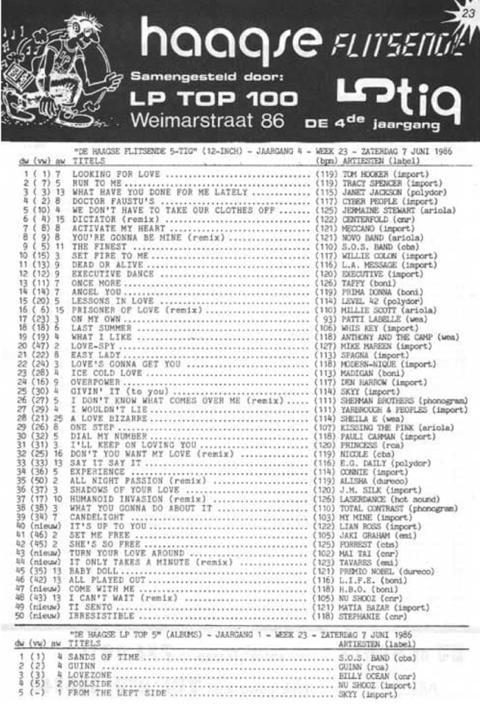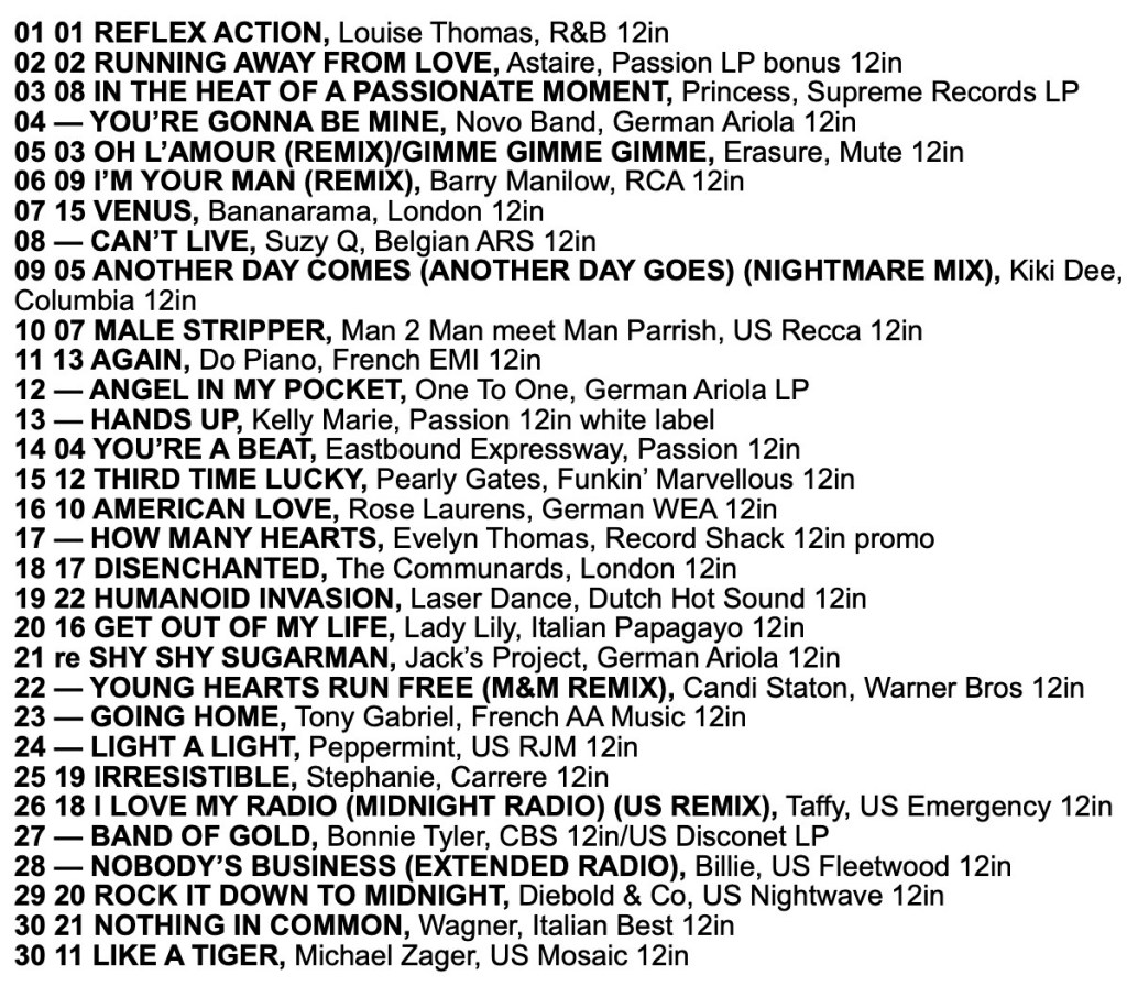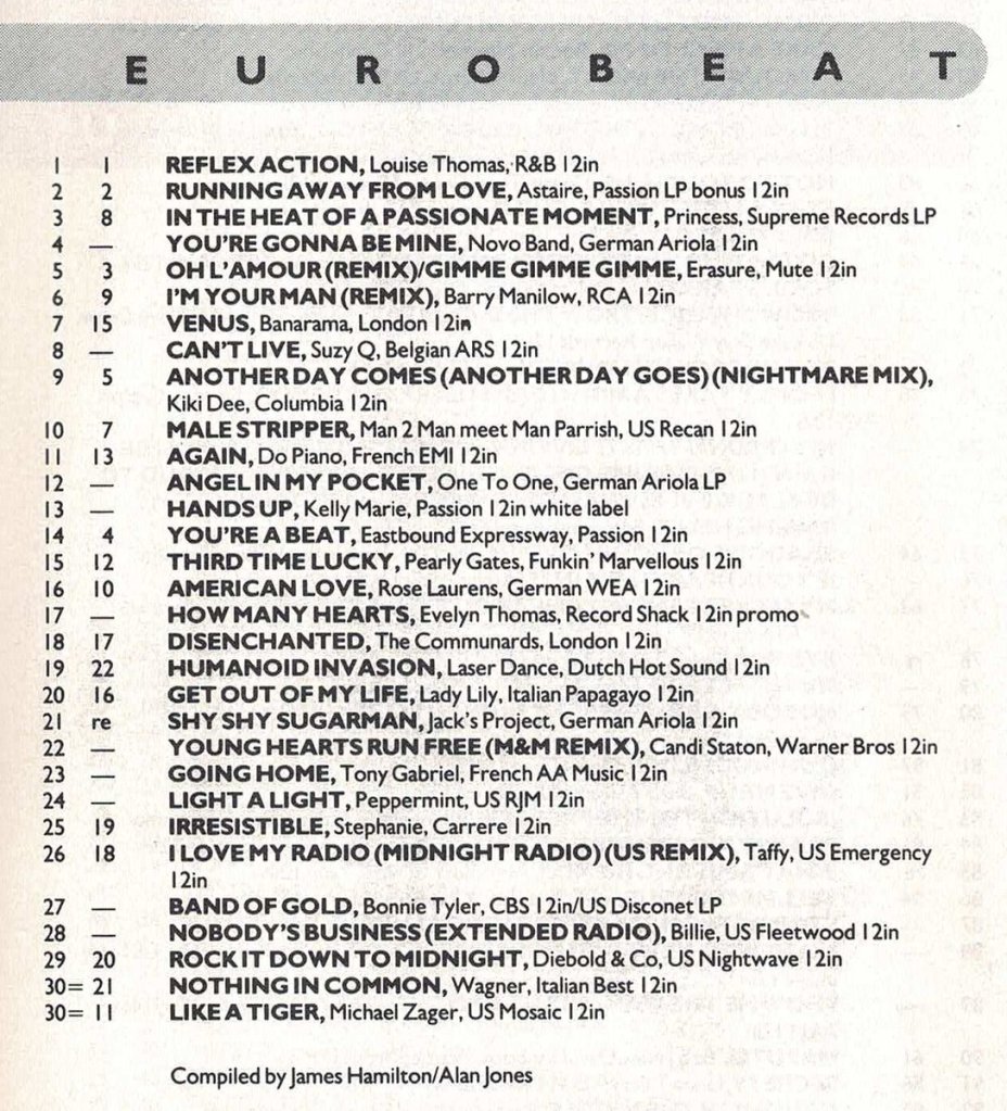 A scan of the original printed Record Mirror Eurobeat Chart from 7th June 1986