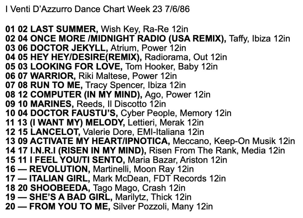 I Venti d’Azurro Italo Disco Chart 7th June 1986