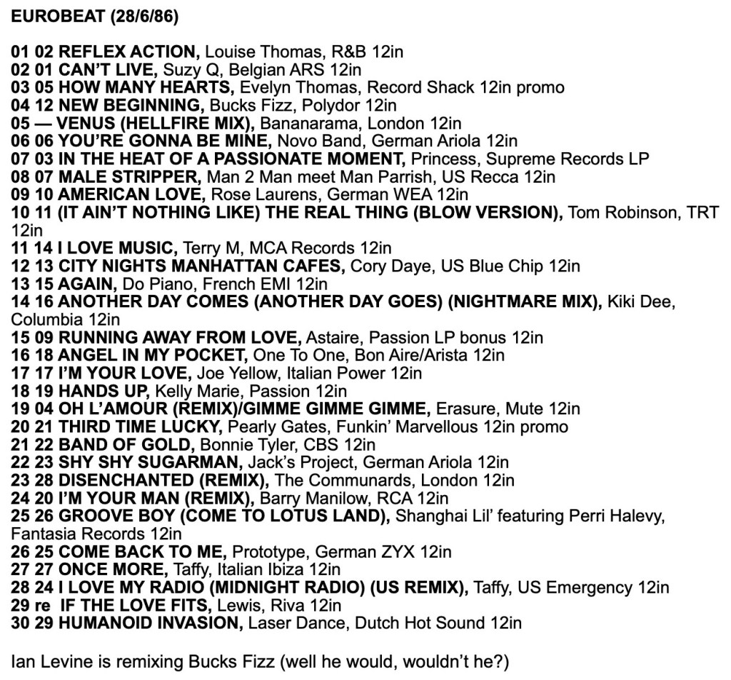 Record Mirror Eurobeat Chart 28th June 1986