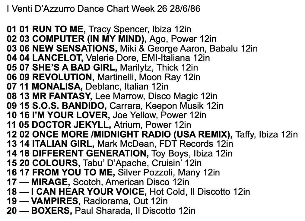 I Venti d’Azurro Italo Disco Chart 28th June 1986