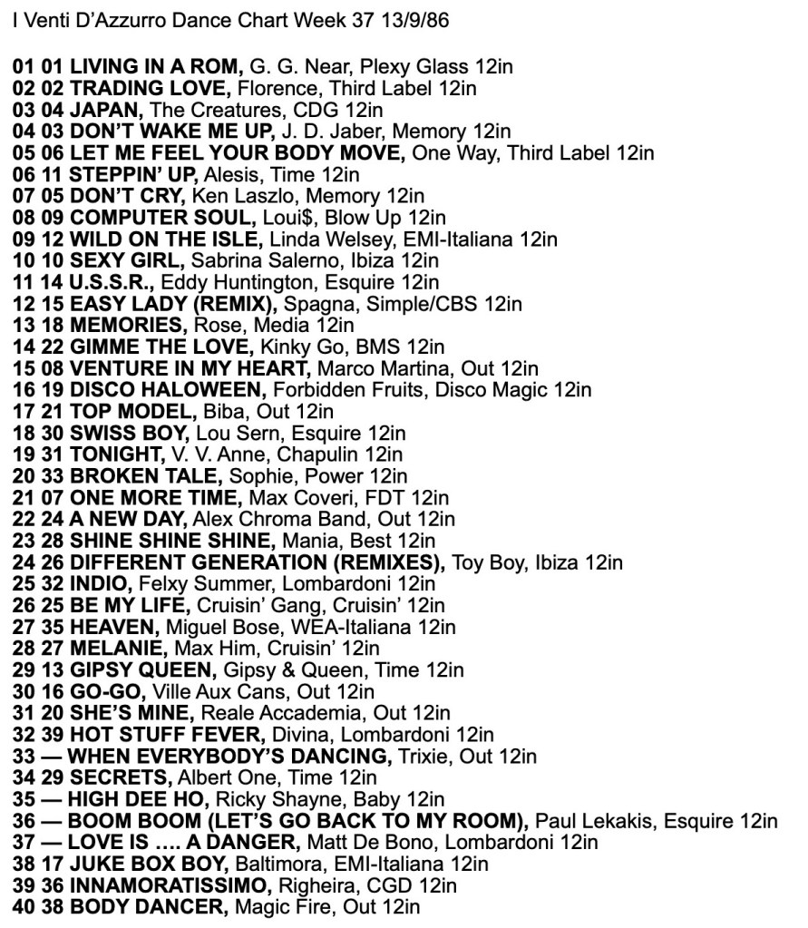 I Venti d’Azurro Italo Disco Chart 13th September 1986