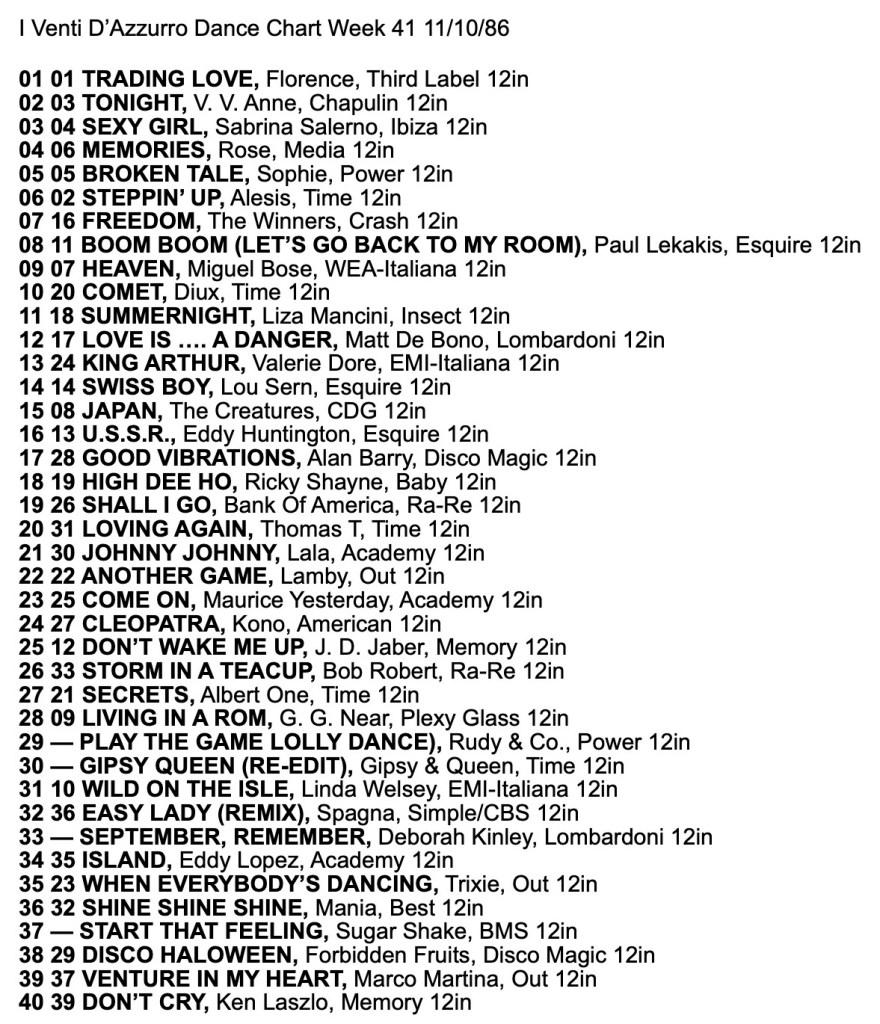 I Venti d’Azurro Italo Disco Chart 11th October 1986