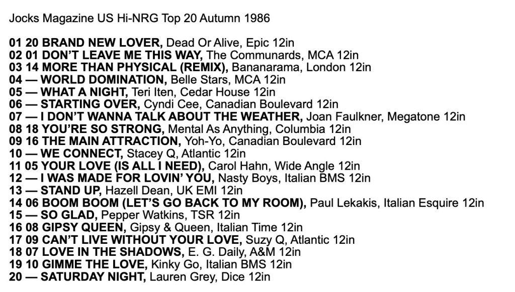 Jocks Magazine Hi-NRG Chart Autumn 1986