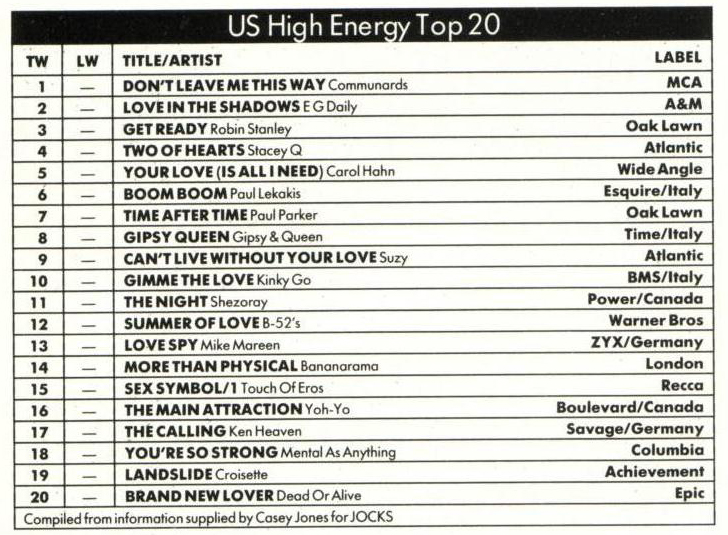 Jocks Magazine started as an industry magazine for British DJs and ran from 1986 to 1991. In these early years, the magazine concentrated mostly on DJ equipment and the world of mobile and radio DJing, rather than dance/club culture. Interviews were mainly with the leading Radio One and provincial DJ stars like Steve Wright, Tony Blackburn and Chris Tarrant. The magazine contained numerous dance charts, including an American Hi-NRG chart like the one published here from autumn 1986.