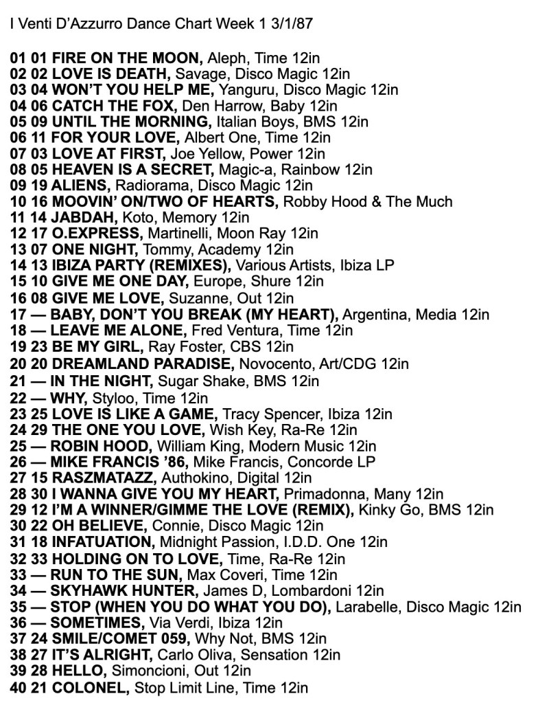 I Venti d’Azurro Italo Disco Chart 3rd January 1987