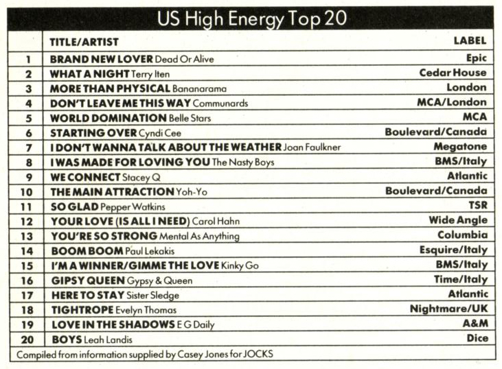 A scan of the original printed USA Hi-NRG Chart printed in Jocks Magazine from January 1987
