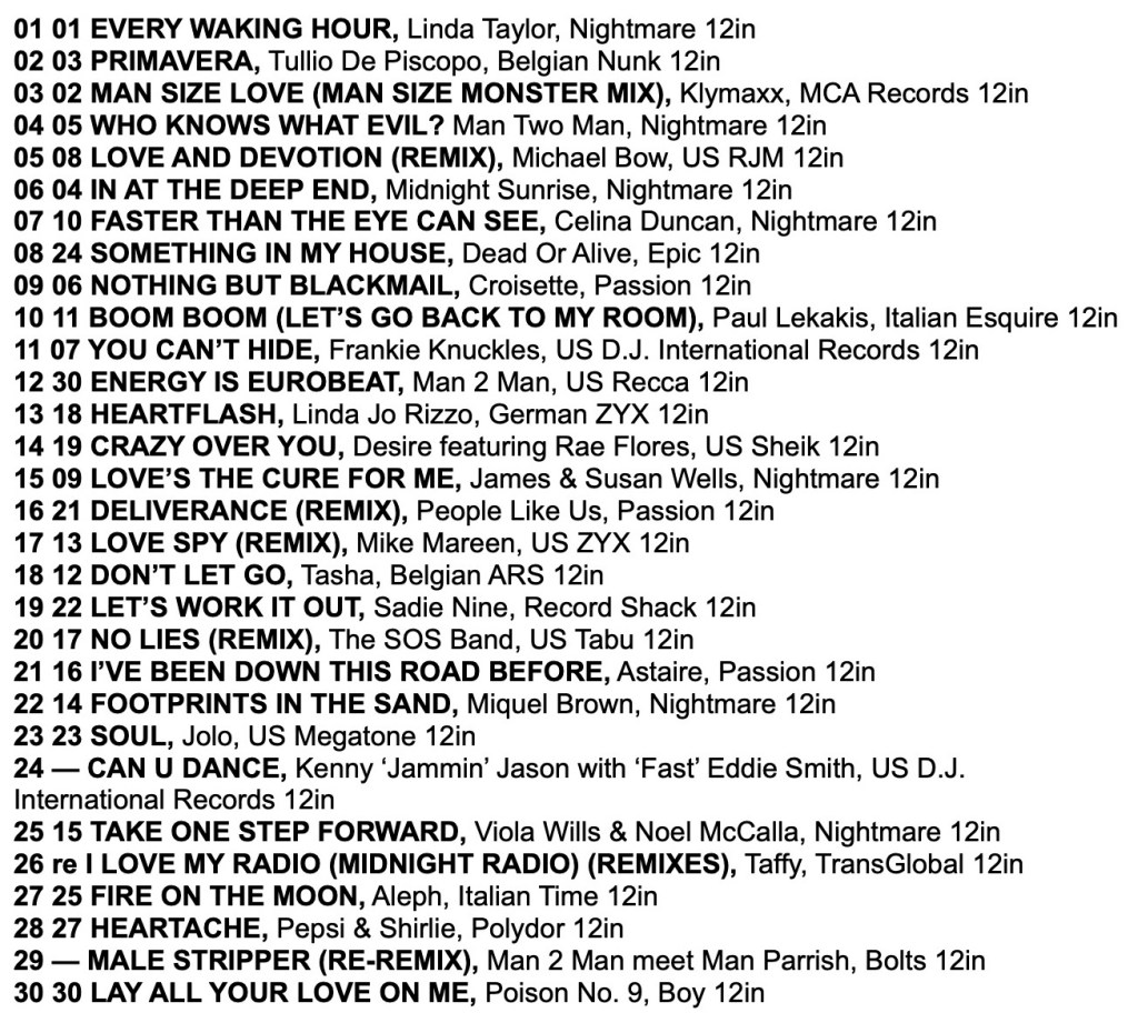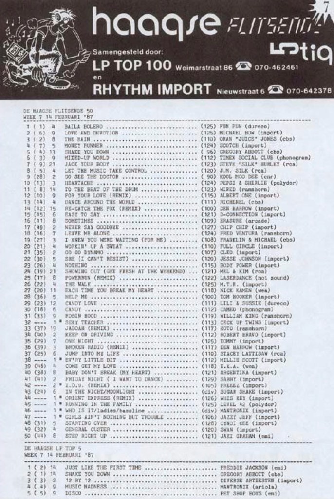 A scan of part of the original printed Record Mirror Eurobeat Chart from 14th February 1987