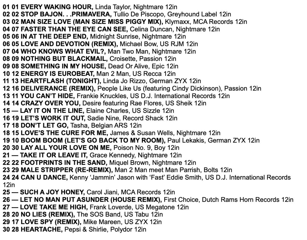 A scan of part of the original printed Record Mirror Eurobeat Chart from 21st February 1987