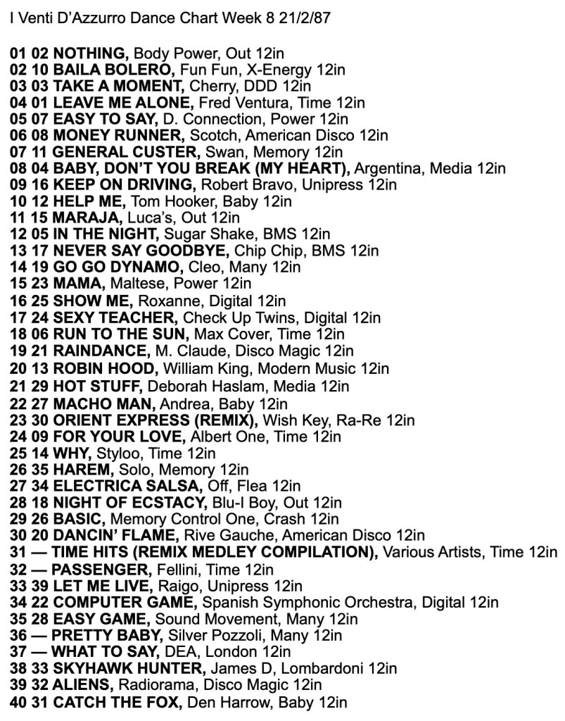 I Venti d’Azurro Italo Disco Chart 21st February 1987