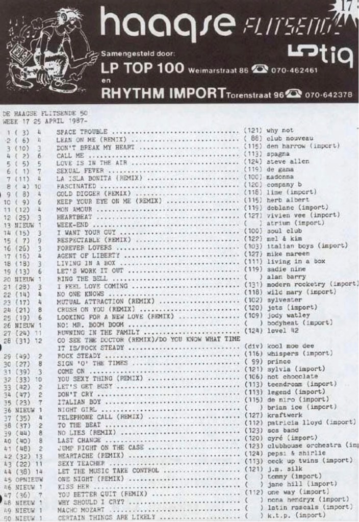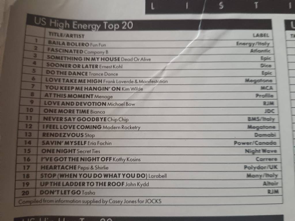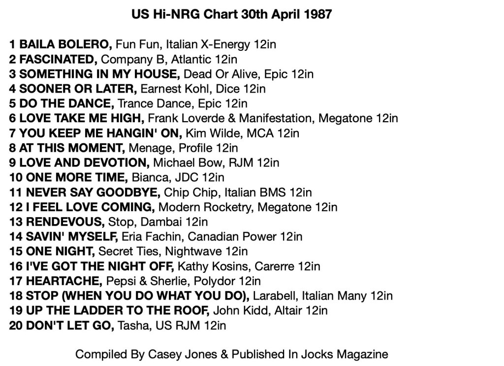 A scan of the original US Hi-NRG Chart printed in Jocks Magazine on 30th April 1987