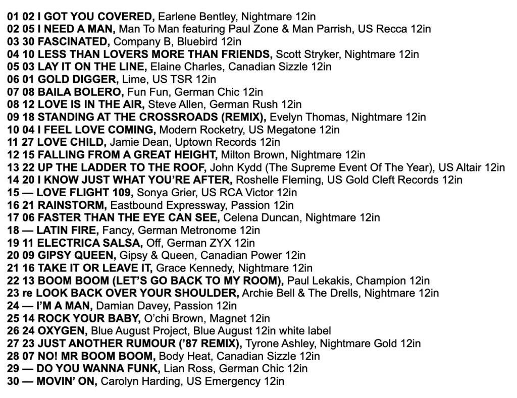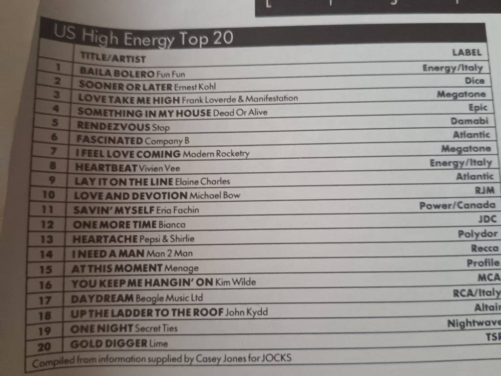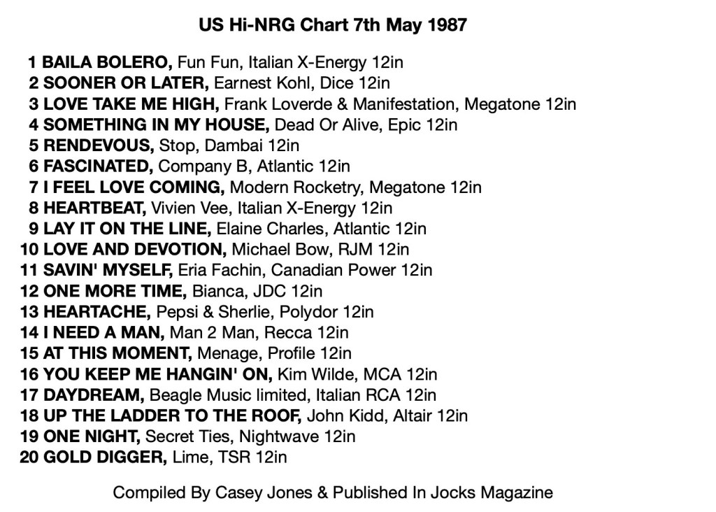 A scan of the original US Hi-NRG Chart printed in Jocks Magazine on 7th May 1987