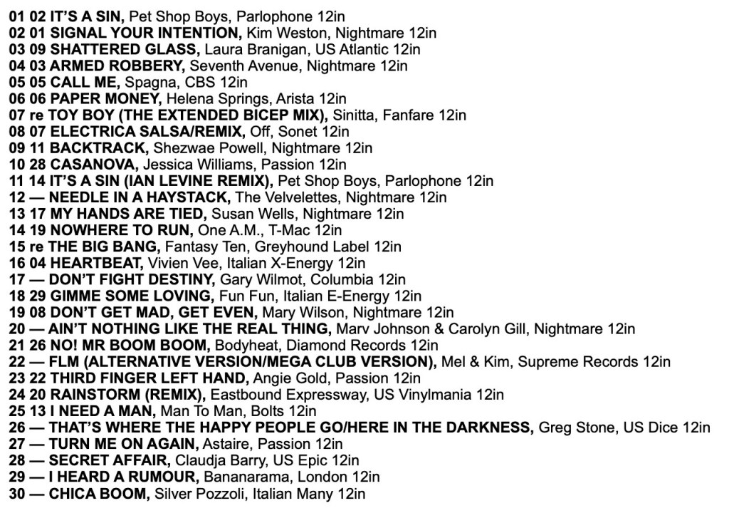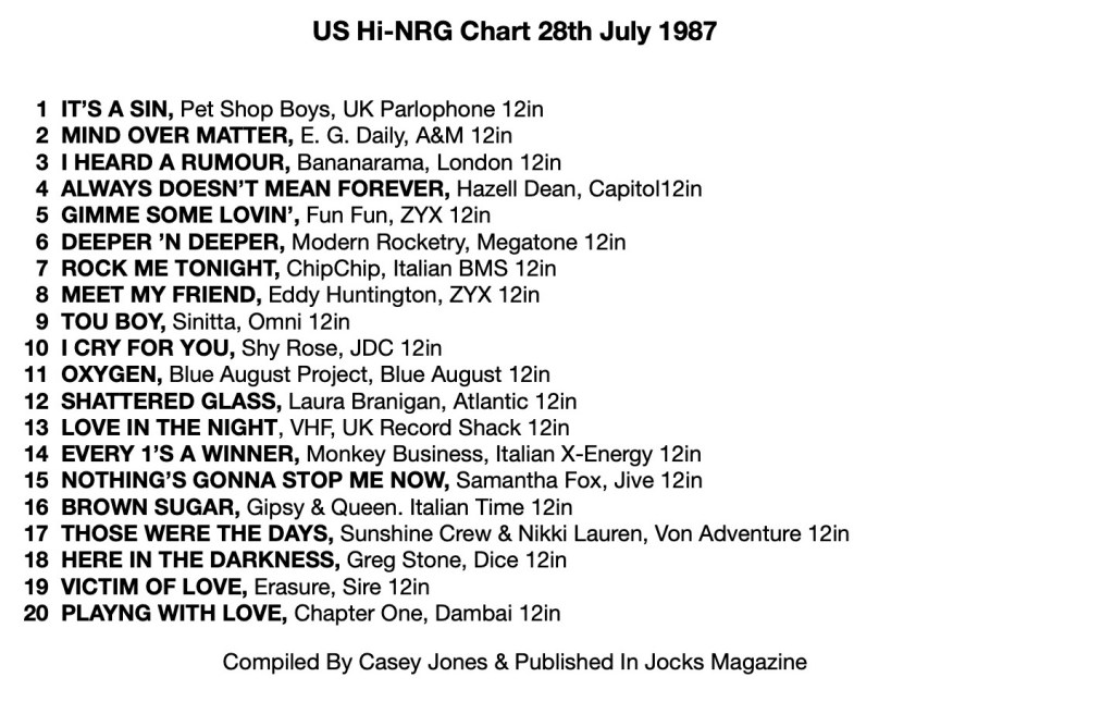 A scan of the original US Hi-NRG Chart printed in Jocks Magazine on 28th July 1987