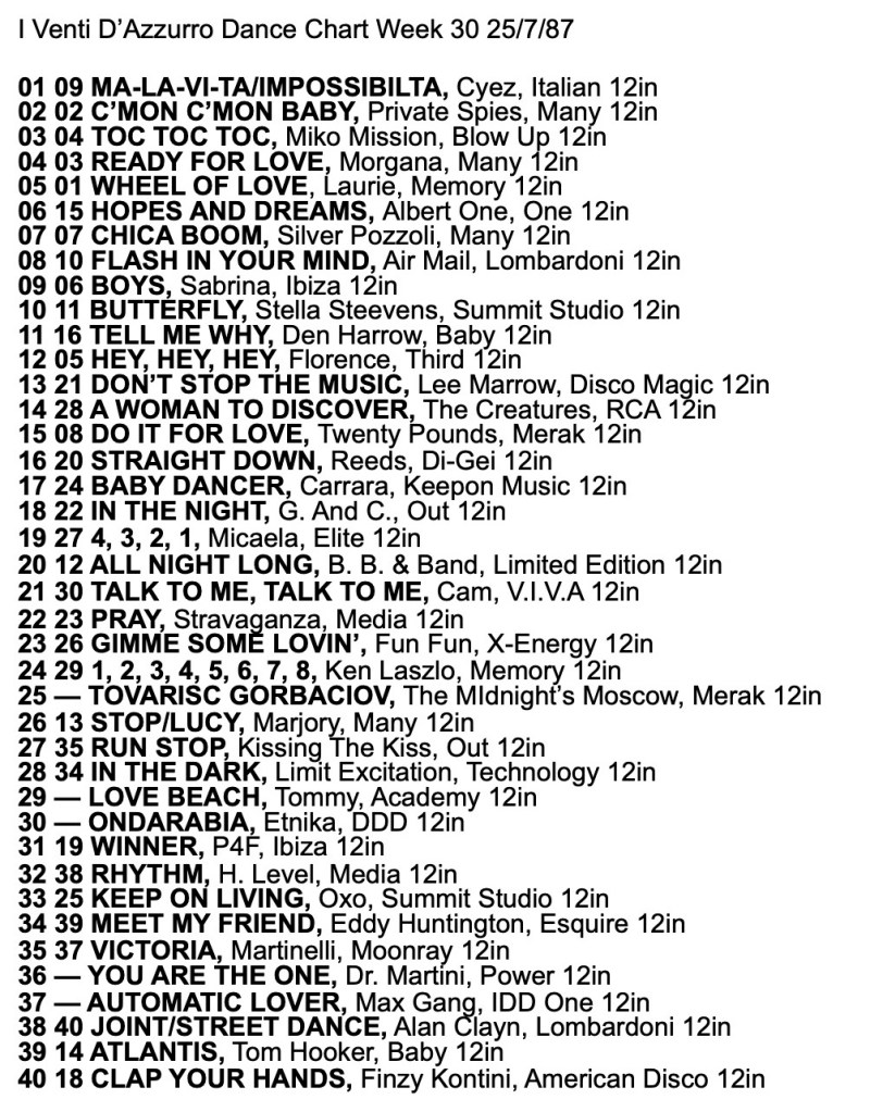 I Venti d’Azurro Italo Disco Chart 25th July 1987