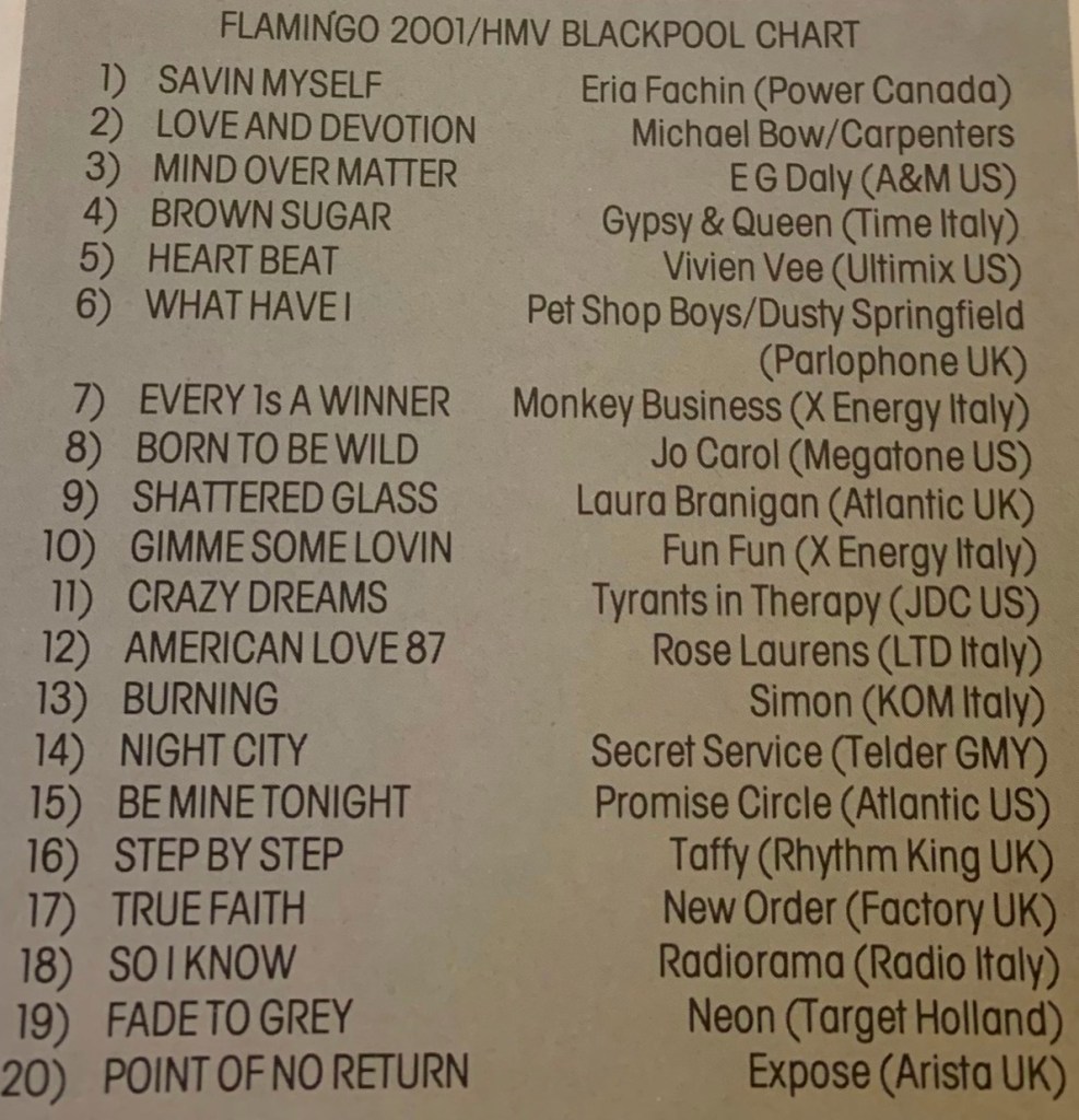 The club contributed a Hi-NRG chart to various publications like Gay Times and Gay News. The below is a Flamingo 2001 club chart, coupled with sales of the records from the local HMV record shop. This chart was published either in Gay Times or Him magazine (unfortunately I don’t know which one), and was published at some point in the Autumn of 1987.